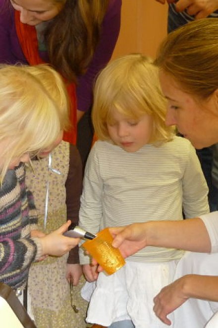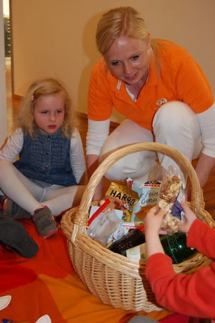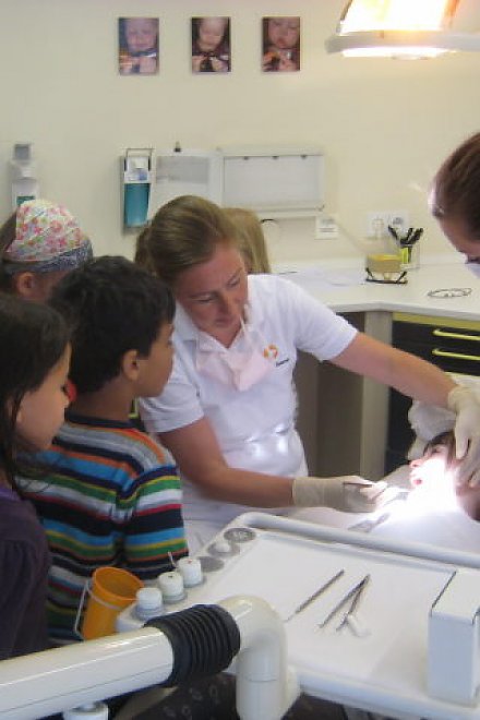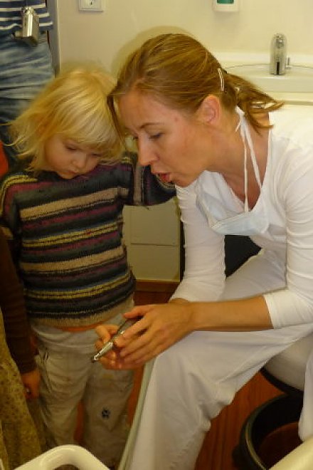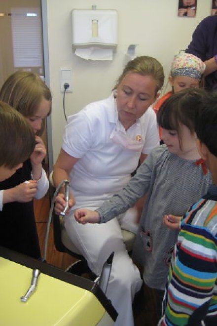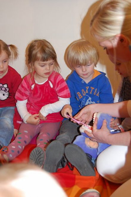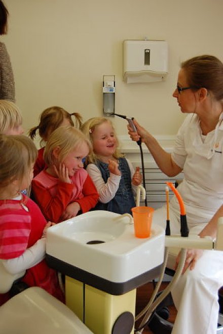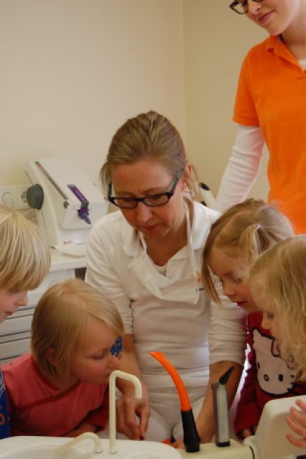 Die 3- bis 6-Jährigen kommen in kleinen Gruppen zu uns, um in ruhiger, spielerischer Atmosphäre eine zahnärztliche Praxis kennen zu lernen. Der Behandlungsstuhl sowie die wichtigsten Instrumente und Geräte werden erklärt. Dabei können dann auch mal die Sauger und der Luft-/Wasser-Püster ausprobiert oder der Behandlungsstuhl hoch- und runtergefahren werden. Eine Zahnputzgeschichte und ein Picknickspiel um gesunde und ungesunde Nahrungsmittel runden den Besuch ab.